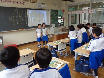今日の国語は、教科書の絵を見て問題を作ったり、答えたりする活動を行いました。