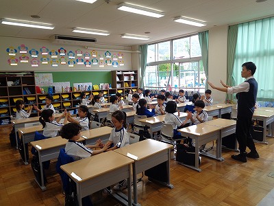 英語の時間は、♪アルプス一万尺のような手遊び歌をペアで練習しました。