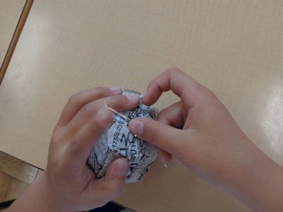 次に、切った新聞紙を丸めて、ボールを作ります。