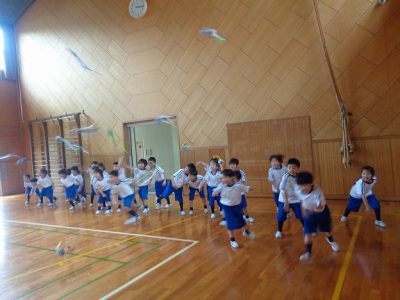 投げる方向に気をつけて、みんなで一斉に投げました。