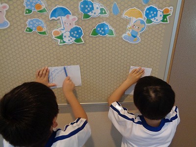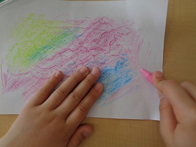 今日は「凸凹名探偵」になって、身の回りにある凸凹を見つけて、クーピーで写し取る学習をしました。