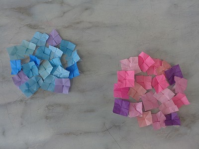 中間休みの前半に、みんなで折り紙であじさいを作りました。