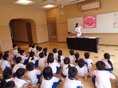 はじめに、紙芝居を見ながら、どうして虫歯になるのか、食生活や歯磨きの仕方を振り返りました。