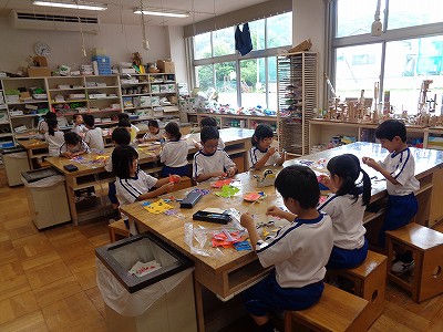 折り紙を折って、切って、開いて、色々な形を作ります。