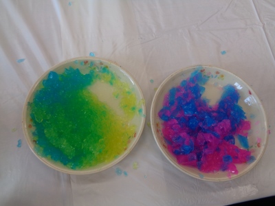 寒天と染料を混ぜて作った冷たいゼリーを使って、造形遊びをしました。