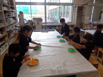 色を混ぜる中で「新しい色ができた!」と目を輝かせて報告してくれました。