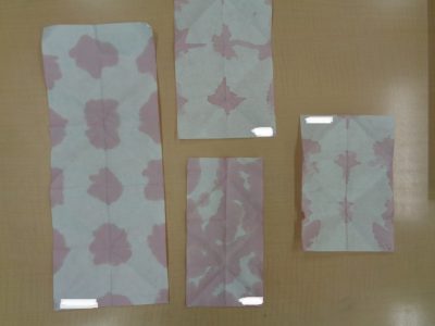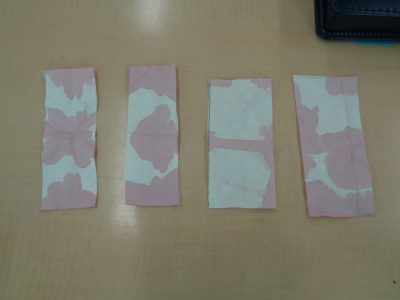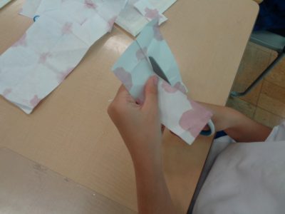 色水の模様をよく見て、どの部分を切り取ろうかな?と考えながら作っています。