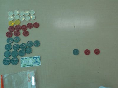 お金の種類を確かめた後、両替や簡単なお金の計算を学習しました。
