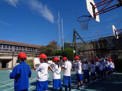 4校時の国語は『くじらぐも』のお話を運動場で音読しました。