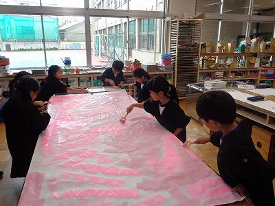 ローラーを使い、同じグループのメンバーと協力しながら絵の具を塗っています。