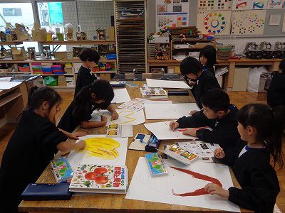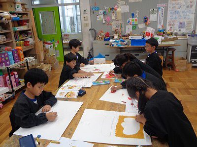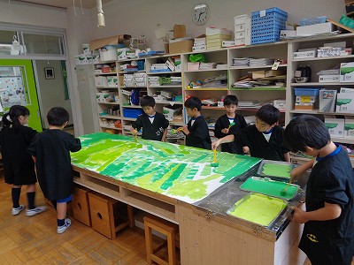 発表会に向けて、今日の図工の時間は、舞台背景作りに取り組みました。
