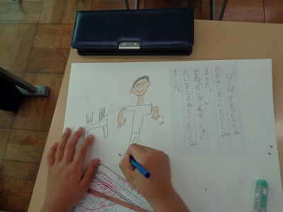 これまでに考えた下書きをもとに、今日は画用紙にお清書をして、新聞の1段目を仕上げました。