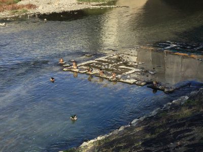 もう少し歩くと、親鳥のカモが集まって陽向ぼっこをしている様子に出会いました。