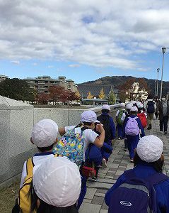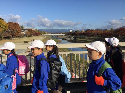 帰りの丸太町橋からは、大文字山が見えました。この後も、てくてく、てくてくとがんばって歩きました。たくさん体を使い、たっぷり楽しめた「てくてく遠足」でした。