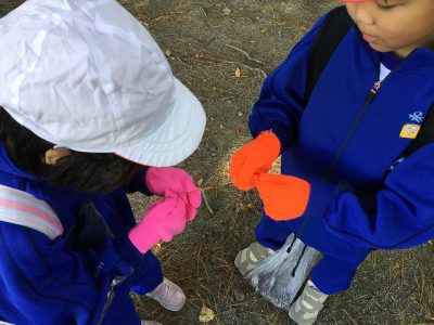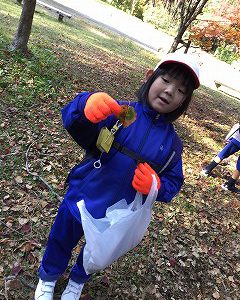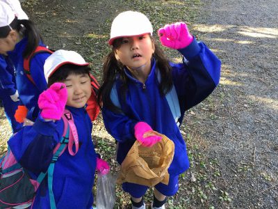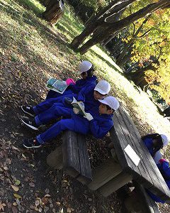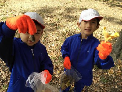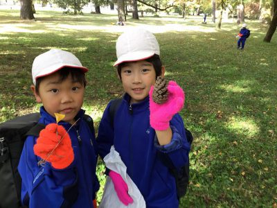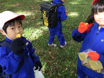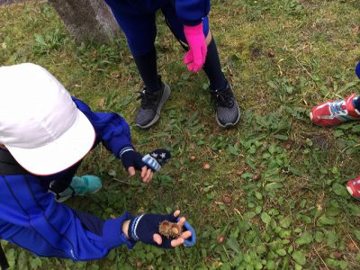 テニスコートの横で、どんぐり拾いをしました。