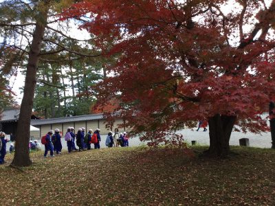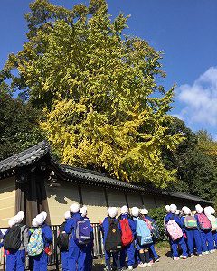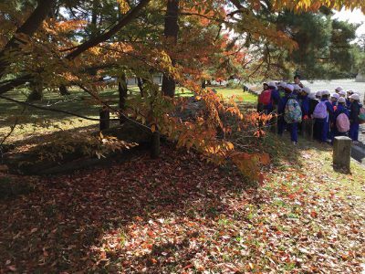 さあ、いよいよ御所とお別れです。紅葉したもみじを横に、学校へ向かいます。