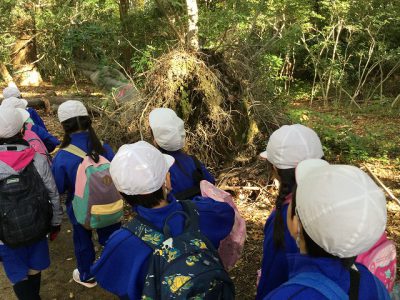 昨年の台風で倒れた木の根っこを見ました。1年生の背より高く大きな根っこの横を通りました。
