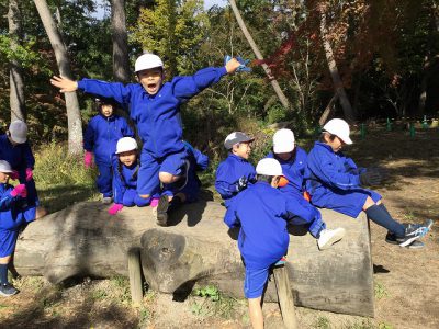 大きな切り株の上も楽しそうです。その根元には、キノコが自生しており、興味津々の子ども達。にぎやかな声が聞こえてくるようです。