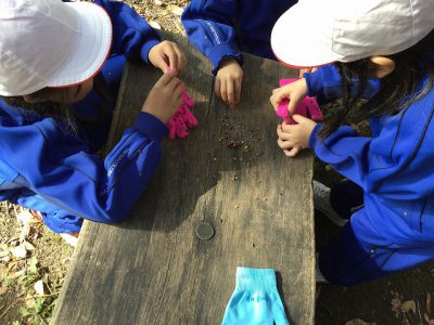 こちらは、せっせとひっつきむし取りを…。手袋に着いたのを取るのは大変そうです。