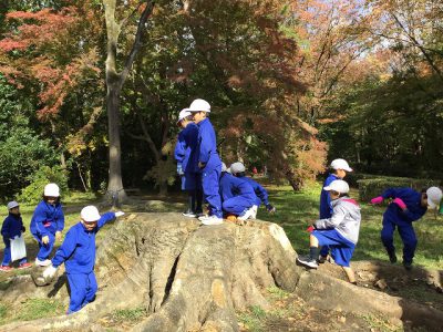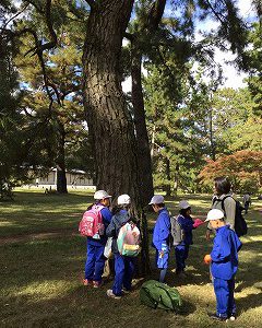 ここからは、学習院跡にある大銀杏の木を目指して、てくてく歩きます。途中で“クヌギ”のどんぐりが落ちているところを通りました。どんぐりは、少なかったのですが、“かさ”がたくさん落ちていたので、明日の造形遊びにと、2個3個いただくことにしました。