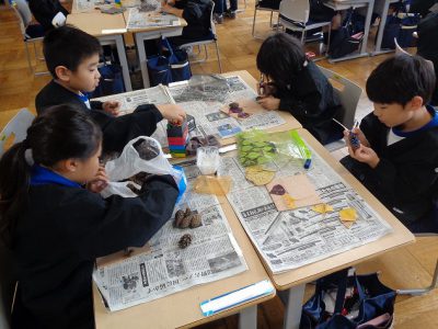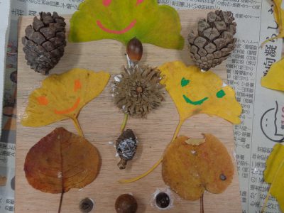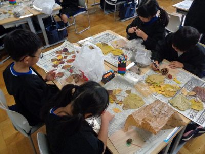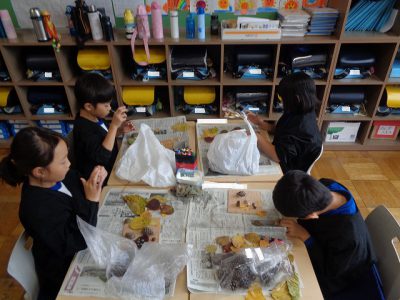 今日の1・2校時は、昨日の遠足で拾った落ち葉や木の実を使って、造形遊びをしました。