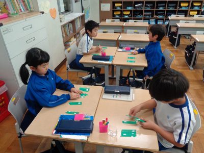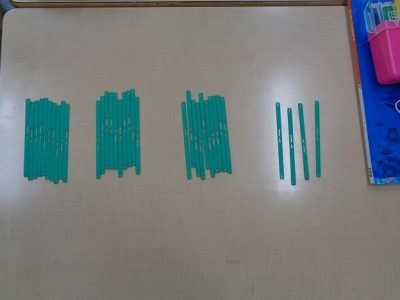 教科書に載っている「数え棒取りゲーム」の活動を通して、「20」より大きい数を工夫して数えました。