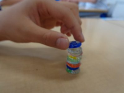 おはじき遊びでは、まず、おはじきを積んで遊びました。