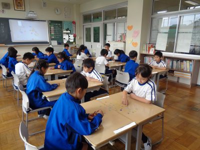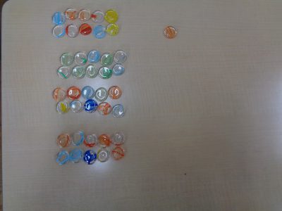机の上に広げたおはじきの数を2人で数えながら、片付けました。
