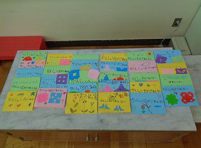 先週、招待状の書き方を学習した後、切り紙を貼ったり、クーピーで絵を描いたりして仕上げています。