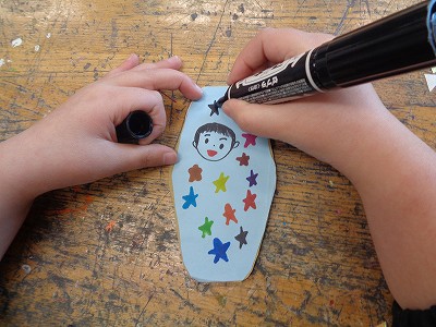 メッセージを書いたり、カップに色を塗ったりしています。