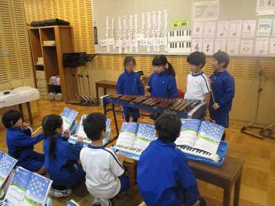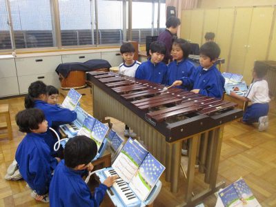 前の時間に作った♪もうひとつの星の音楽♪を鍵盤ハーモニカでリレー演奏する合間に、木琴や鉄琴で♪きらきら星を響かせます。