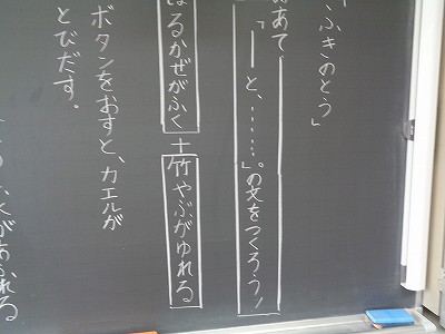 「ボタンを押すと、帰るが飛び出す」や「氷を入れすぎると、水がこぼれる」のように、教科書の挿絵を見て、一人ひとりがオリジナルの文を考えました。