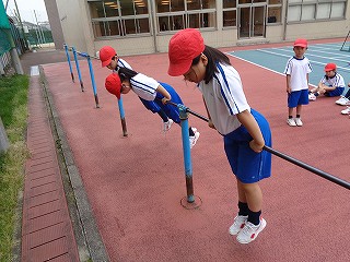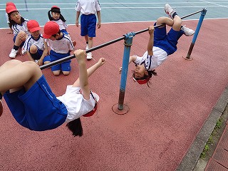 鉄棒では「つばめ」「前回り」「足かけ回り」「こうもり」など、レベルを少しずつ上げて、練習していきました。