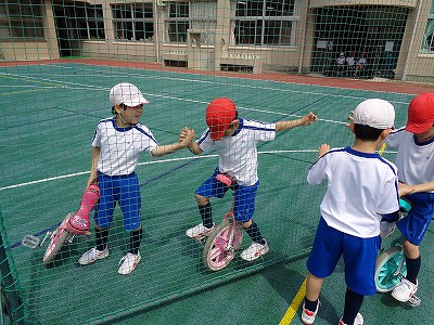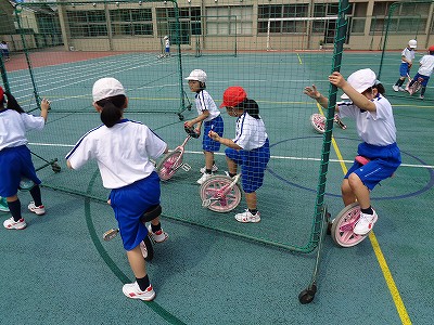 一輪車では、マスターしている友だちからアドバイスをもらい、楽しんで活動していました。