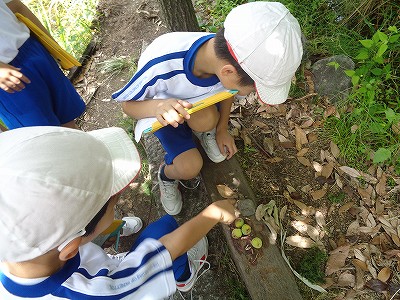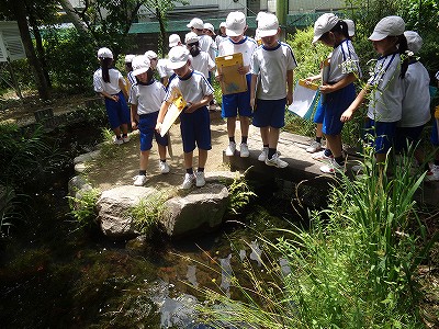 生活科では、校庭(ビオトープ)のマップ作りへ向けて、草花・生き物を観察しました。