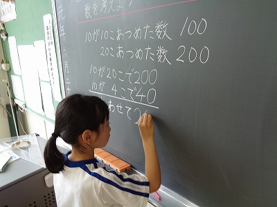 この学習のまとめには『10がいくつで・・・、100がいくつで・・・』を使って、足し算・引き算の説明ができるところまでを達成する計画です。