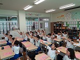 リスニング&発音練習も兼ねた「メイシーちゃんのおかいもの」の読み聞かせでは、馴染みある単語が多く有り、大いに盛り上がっていました。文章にないセリフも、ミスターヨコヤマが語ってくれて、お話をより楽しく聞かせてもらいました。