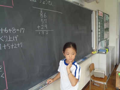 位をそろえて、3段で書くことや計算の順番を守ること、繰り上がりを忘れないなど、ポイントを押さえて丁寧に問題を解くことができていました。
