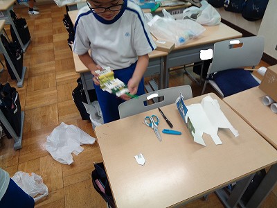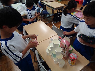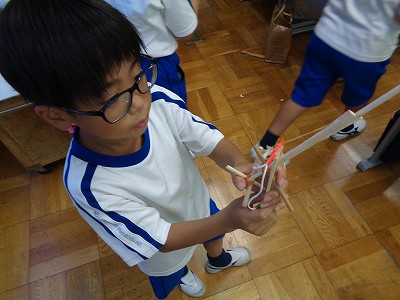 わりばしや紙コップ、段ボールを使って、上手に作ることが出来ました。