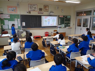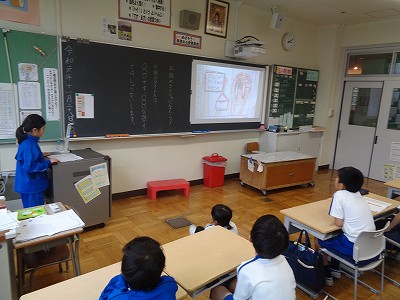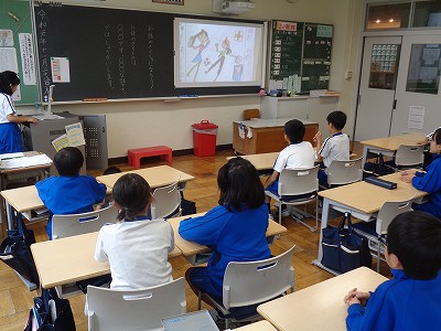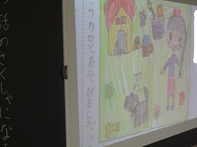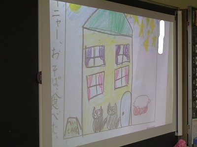 学習のまとめには、スクリーンにお話の絵を映し出し、紹介してもらいました。