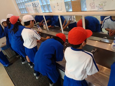 根っこマラソンの後は、手洗い・うがいを促す声が広がっていました。
