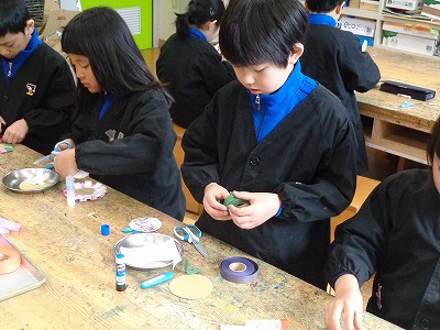 バッジの一つ一つに、二年生の感謝の思いをのせて仕上げていきます。