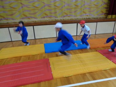 マット運動、跳び箱、バスケット、ケンパ、縄とびを繰り返し、筋力と持久力を高めていきます。