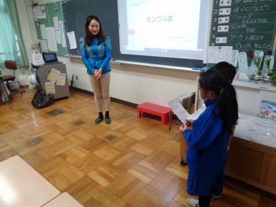 前半は、モンゴルの国旗の意味や首都、特徴をクイズと交えながら説明されました。子ども達にとって、新しい知識がたくさん得られたことでしょう。