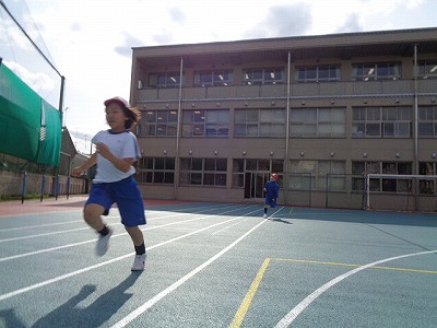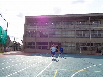 今日は、運動場半周を「7秒ぴったり」で走れるように、スタート位置をずらして走りました。