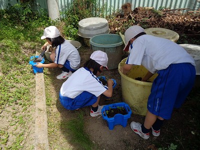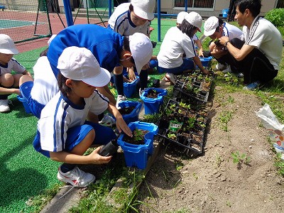 理科の学習では、ポットで育てたホウセンカとマリーゴールドを、鉢に植え替えました。