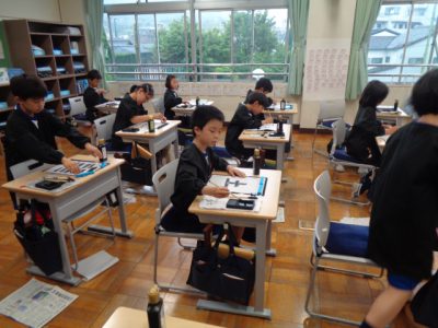 右上がりに横画を書くこと、縦画の書きはじめの筆の角度に気をつけながら、集中して書き上げました。
