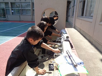 終了後、今日は運動場に出て、硯と筆をきれいに洗いました。