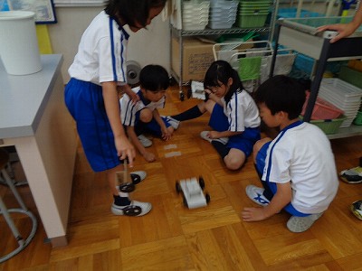 理科は「ゴムの強さ」についての学習です。ゴムのひっぱる強さを変え、車の進む距離について調べました。