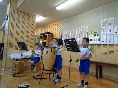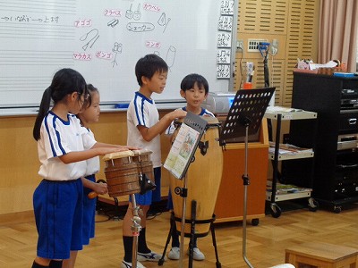 音楽室から、楽器の音がにぎやかに聞こえてきました。見てみると、「まほうのチャチャチャ」の曲に合わせて、チームごとに考えた音楽を発表中でした。